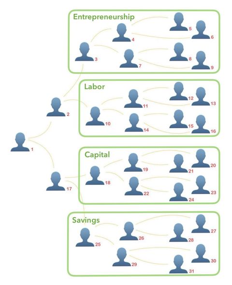 When the team leader logs into Org913.com he or she will see the team-structure part and the active-management part of this Skills 31 Teams® Organizational Structure. The team-structure part has 31 positions where two 15-member positions are connected to the team leader’s position.